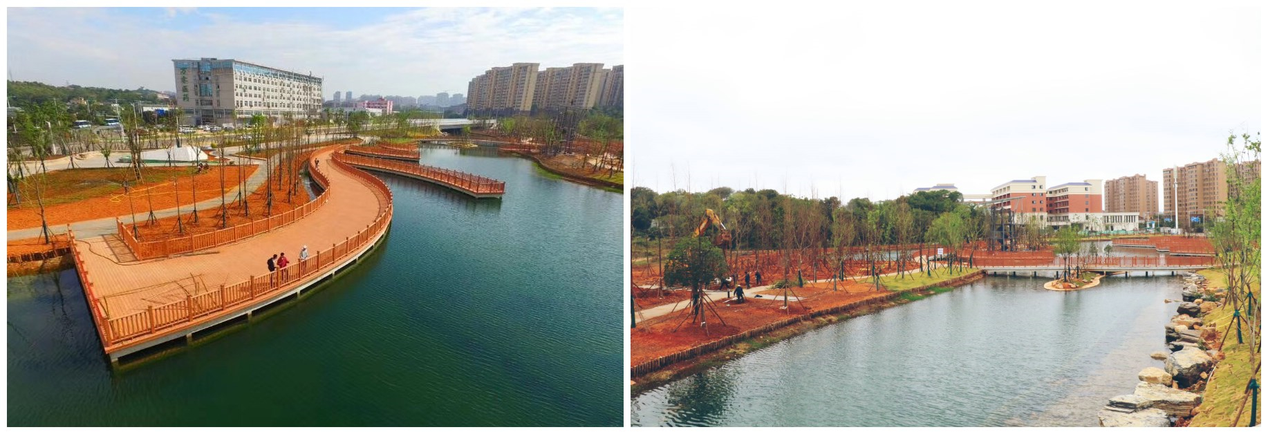港子河綜合整治項目位于長沙市天心區(qū)先鋒街道(長沙理工大學云塘校區(qū)西側(cè)),起點箱涵出口,終點為新電路,全長約811米,總面積53846平方米,其中水域面積17670平方米、綠化面積30435平方米。