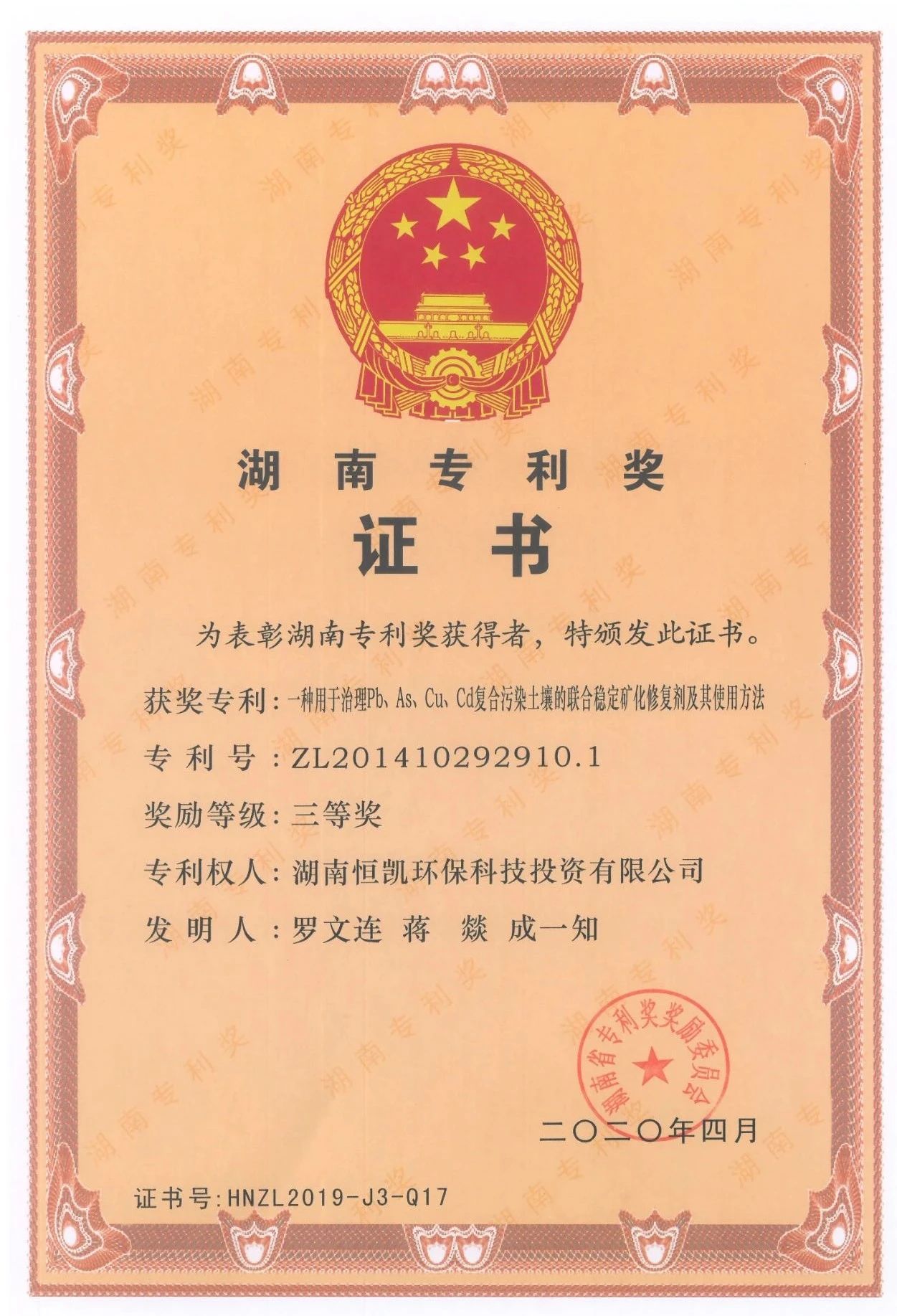 近日,在2020湖南知識(shí)產(chǎn)權(quán)宣傳周啟動(dòng)儀式上,2019年度湖南專(zhuān)利獎(jiǎng)揭曉,恒凱環(huán)保自主研發(fā)的發(fā)明專(zhuān)利“一種用于治理Pb、As、Cu、Cd復(fù)合污染土壤的聯(lián)合穩(wěn)定礦化修復(fù)劑及其使用方法”榮獲湖南省專(zhuān)利三等獎(jiǎng)。