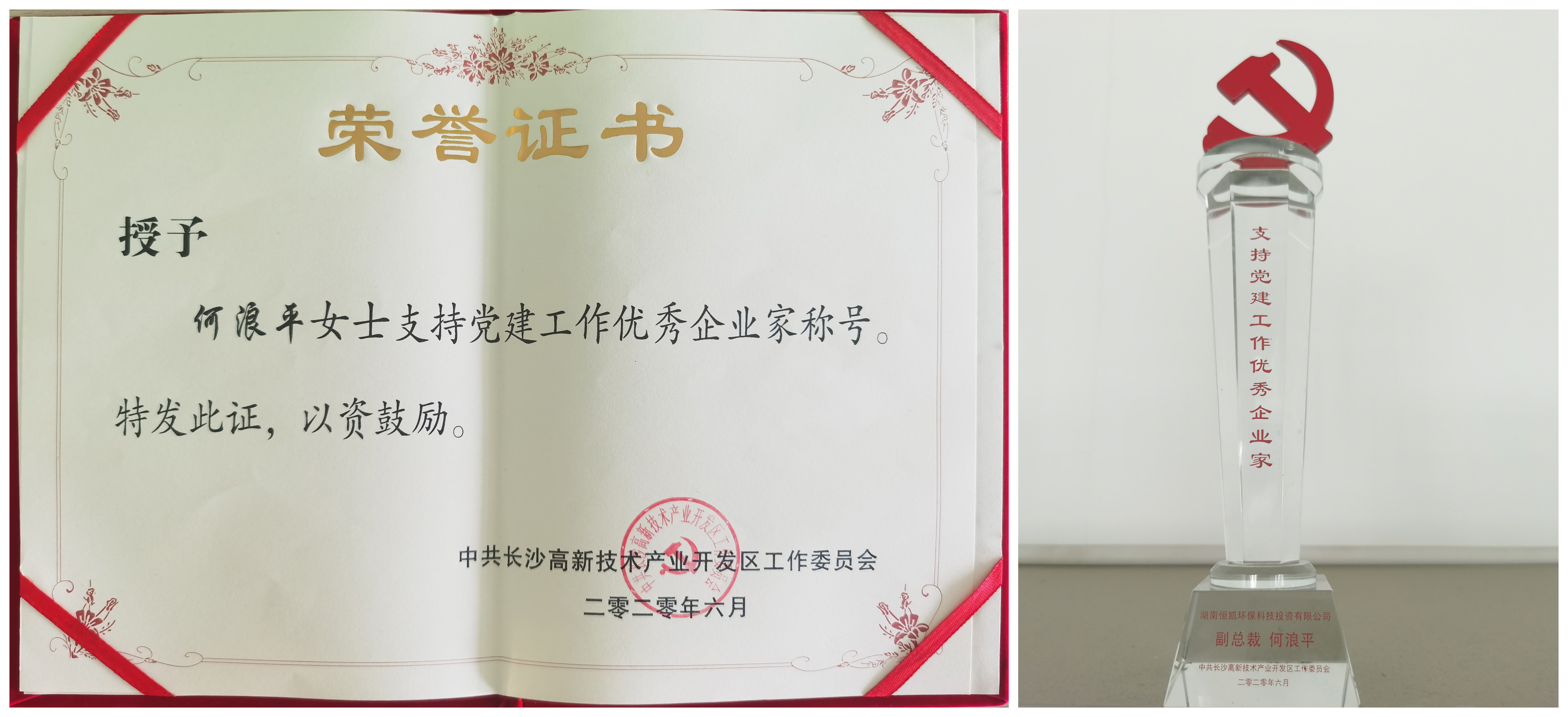 6月28日,在中共長沙高新技術(shù)產(chǎn)業(yè)開發(fā)區(qū)工作委員會舉行的慶祝建黨九十九周年暨“七一”表彰大會上,恒凱環(huán)保黨委副書記、副總裁何浪平同志獲評“支持黨建工作優(yōu)秀企業(yè)家”稱號。